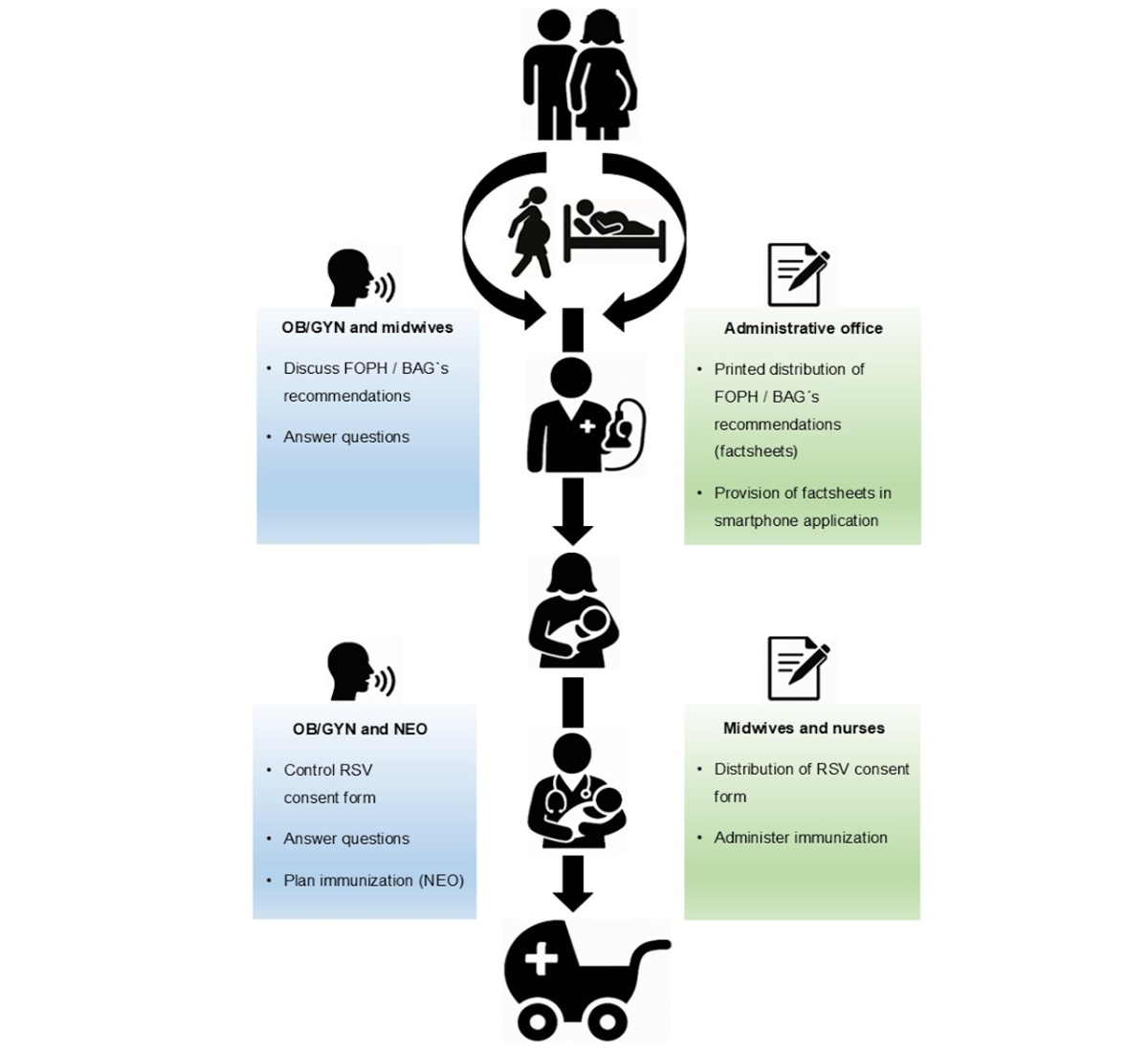 During pregnancy consultations by obstetricians and/or midwives, all expectant parents are informed about passive RSV immunisation. Printed fact sheets by the Swiss Federal Office of Public Health are included in the maternity documents sent by post to every woman planning to deliver at our centre. Additionally, these fact sheets are placed in the hospital’s digital maternity pass/application, available to every woman who has had a consultation at our centre [10].