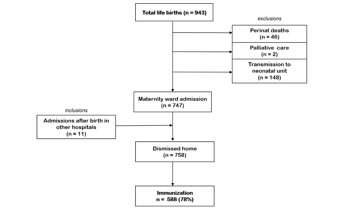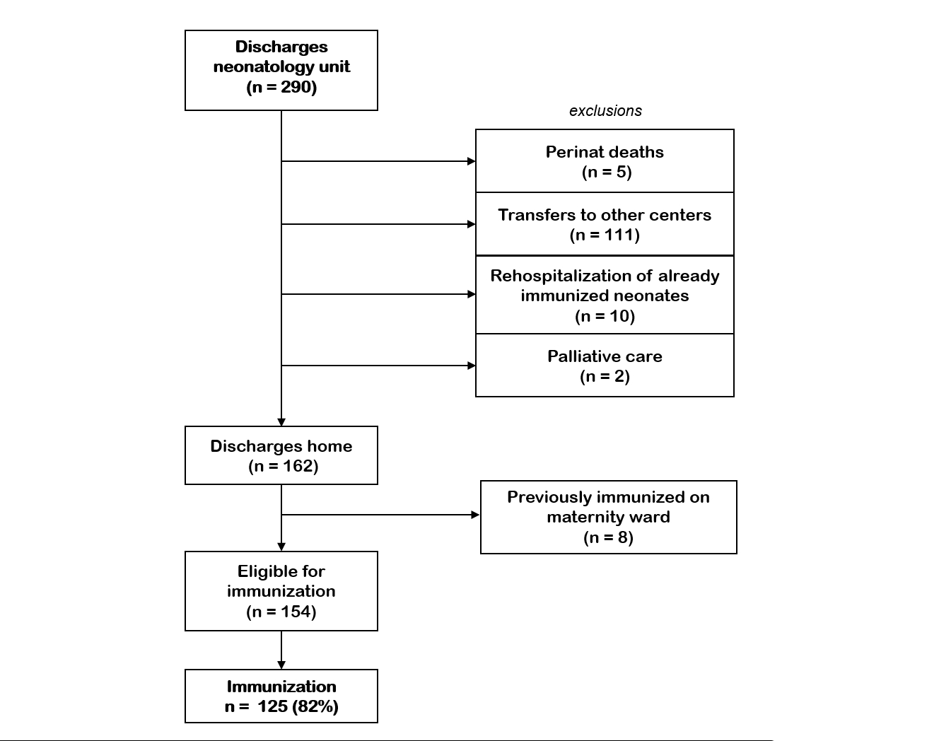 During the study period, 758 newborns were discharged home from the maternity ward with an RSV immunisation coverage of 78% (n = 588). A further 153 newborns were discharged home from the neonatology unit, of whom 125 were immunised (82%) (figures 2 and 3).