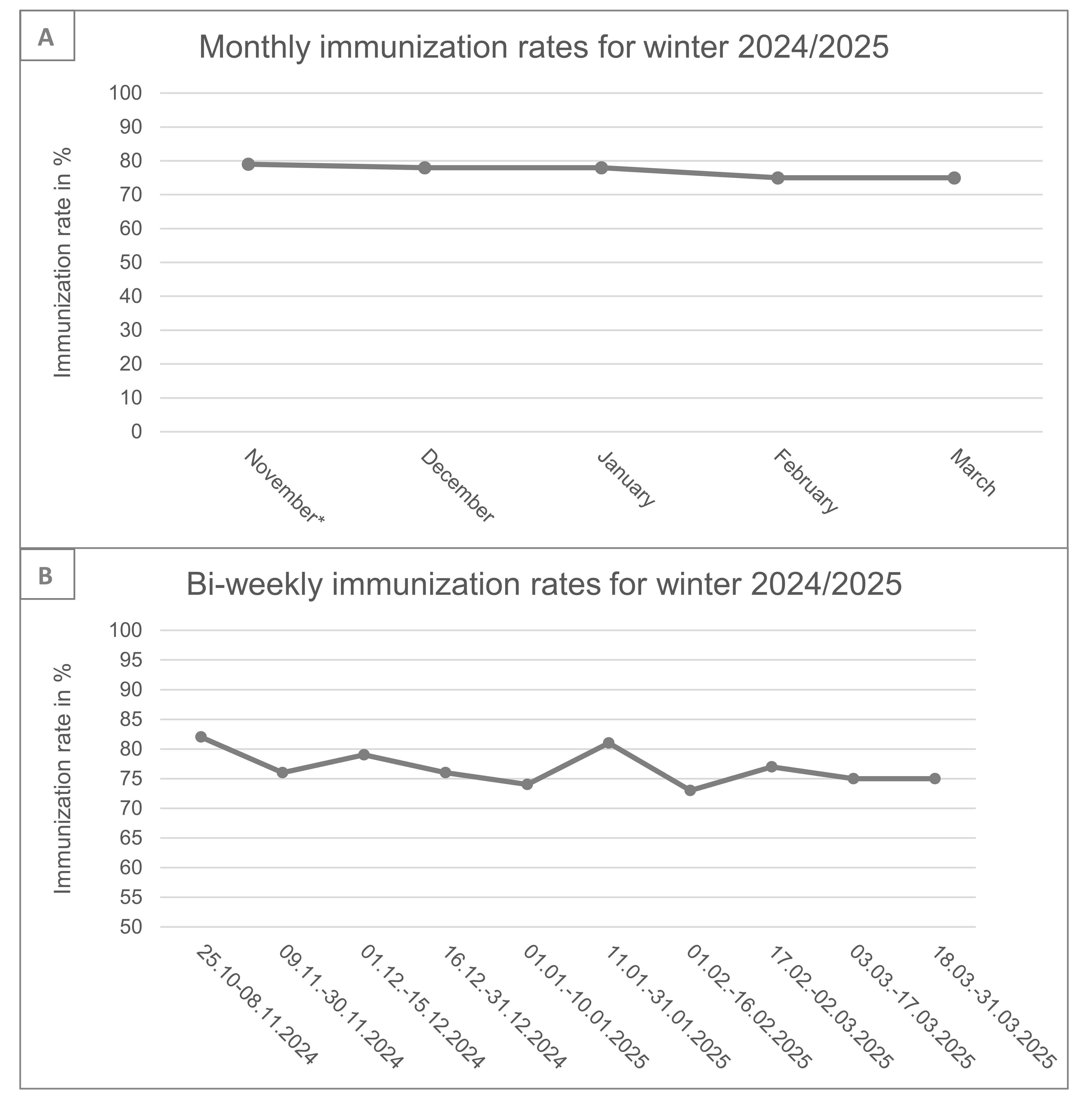 Figure 4Monthly (A) and fortnightly (B) immunisation rates for RSV with nirsevimab or maternal vaccination (Abrysvo®) in newborns discharged home from the maternity ward during the 2024/25 winter season at University Hospital Zurich. * includes immunisations from 28 to 31 October.