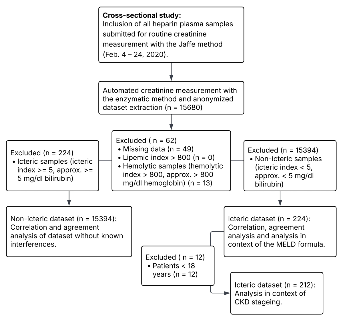Over a period of three weeks, from 4 to 24 February 2020, every heparin plasma sample (n = 15,680; median patient age: 60, standard deviation: 17.8 years, male/female ratio: 57%/43%) submitted for creatinine measurement to the Institute of Clinical Chemistry at University Hospital Zurich was included for the method comparison (figure 1). In an anonymised dataset, the creatinine measurements, icteric index, haemolysis index, lipaemia index and eGFR were exported for statistical analysis. Data points with missing values were excluded (n = 49). Lipaemic samples with an index >800 (n = 0) and haemolytic samples with an index >800 (approx. 800 mg/dl haemoglobin) (n = 13) were not included, due to interference with the Jaffe and the enzymatic assay, respectively. The remaining dataset (n = 15,618) was split into a non-icteric dataset (icteric index <5, approx. <5 mg/dl bilirubin) (n = 15,394) and an icteric dataset (icteric index >5, approx. >5 mg/dl bilirubin) (n = 224) for further analysis. For the eGFR calculations, patients aged <18 years were excluded (n = 12).