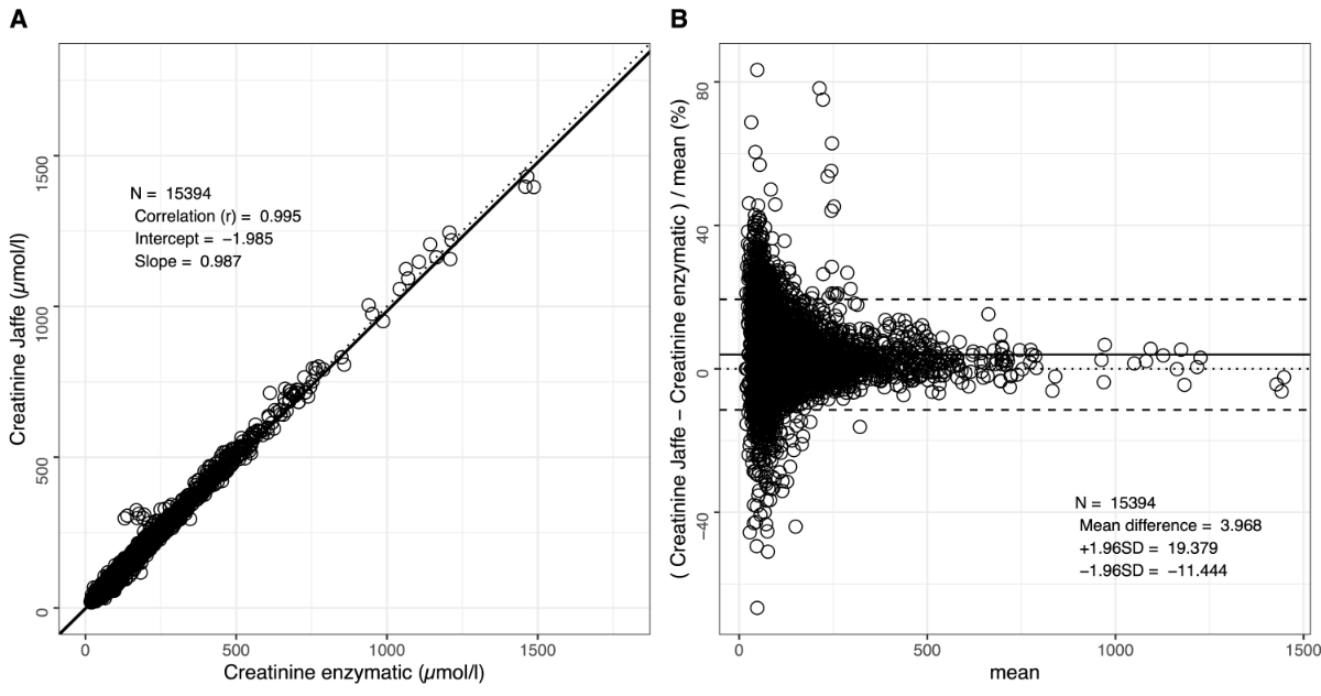 This cross-sectional analytical study included all heparin plasma samples submitted for routine creatinine measurement over a 3-week period (4–24 February 2020), resulting in an anonymised dataset of 15,618 samples. The dataset contains several samples from individual patients with follow-up examinations. The study was conducted under an ethics waiver granted by the Cantonal Ethics Committee of Zurich (BASEC-Nr. Req-2024-01036). The primary outcome of the study was the assay-specific bias between Jaffe and enzymatic creatinine measurements across increasing levels of bilirubin. Secondary outcomes included the impact of this bias on eGFR-based chronic kidney disease staging and MELD score calculation.