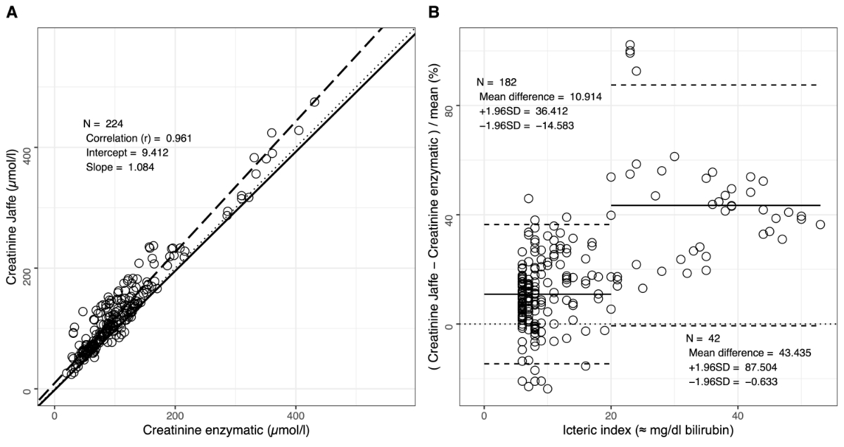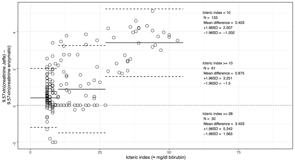 Creatinine concentrations were determined in February 2020 with the Creatinine Jaffe Gen.2 (CREJ2) assay, which is routinely used at our institute and includes rate blanking, and the enzymatic Creatinine plus ver.2 (CREP2) assay, both from Roche, on a Roche Cobas 8000 c702 system. The icteric index, haemolysis index and lipaemia index were measured on a Cobas C502 system. Icteric and haemolysis index correspond approximately to bilirubin and haemoglobin concentrations in mg/dl, respectively. The lipaemia index corresponds to turbidity. According to the manufacturer, the Jaffe assay is interfered by an icteric index >5 for conjugated bilirubin and >10 for unconjugated bilirubin, while the enzymatic assay is interfered by an icteric index >15 for conjugated bilirubin and an icteric index >20 for unconjugated bilirubin.