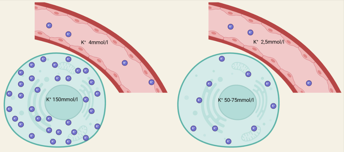 Figure 1Ratio of intra- and extracellular potassium in a physiological state (left) and in hypokalaemia (right) (Created in BioRender. Oswald S, 2025. https://BioRender.com/e47g425).