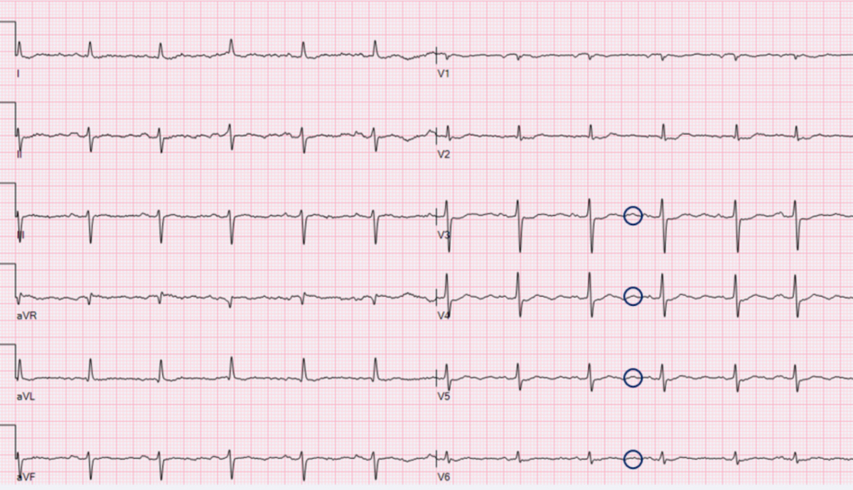 Figure 2ECG with U-waves (indicated by circles) in a patient with severe hypokalaemia after prolonged diarrhoea (ECG recorded at Kepler Universitätsklinikum Linz, 2025).