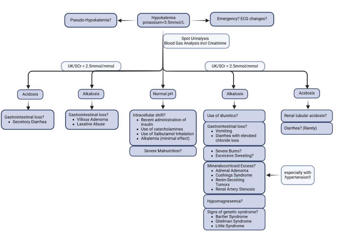 Figure 3A simple diagnostic algorithm to determine the cause of hypokalaemia for use in the emergency department (created in BioRender. Oswald S, 2025) https://BioRender.com/j66q296).
