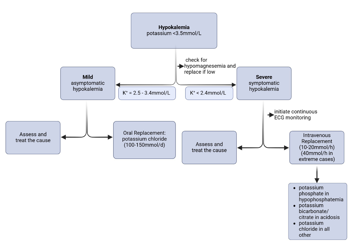 Figure 4Simple therapeutic approach to hypokalaemia (created in BioRender. Oswald S, 2025. https://BioRender.com/y77b088).