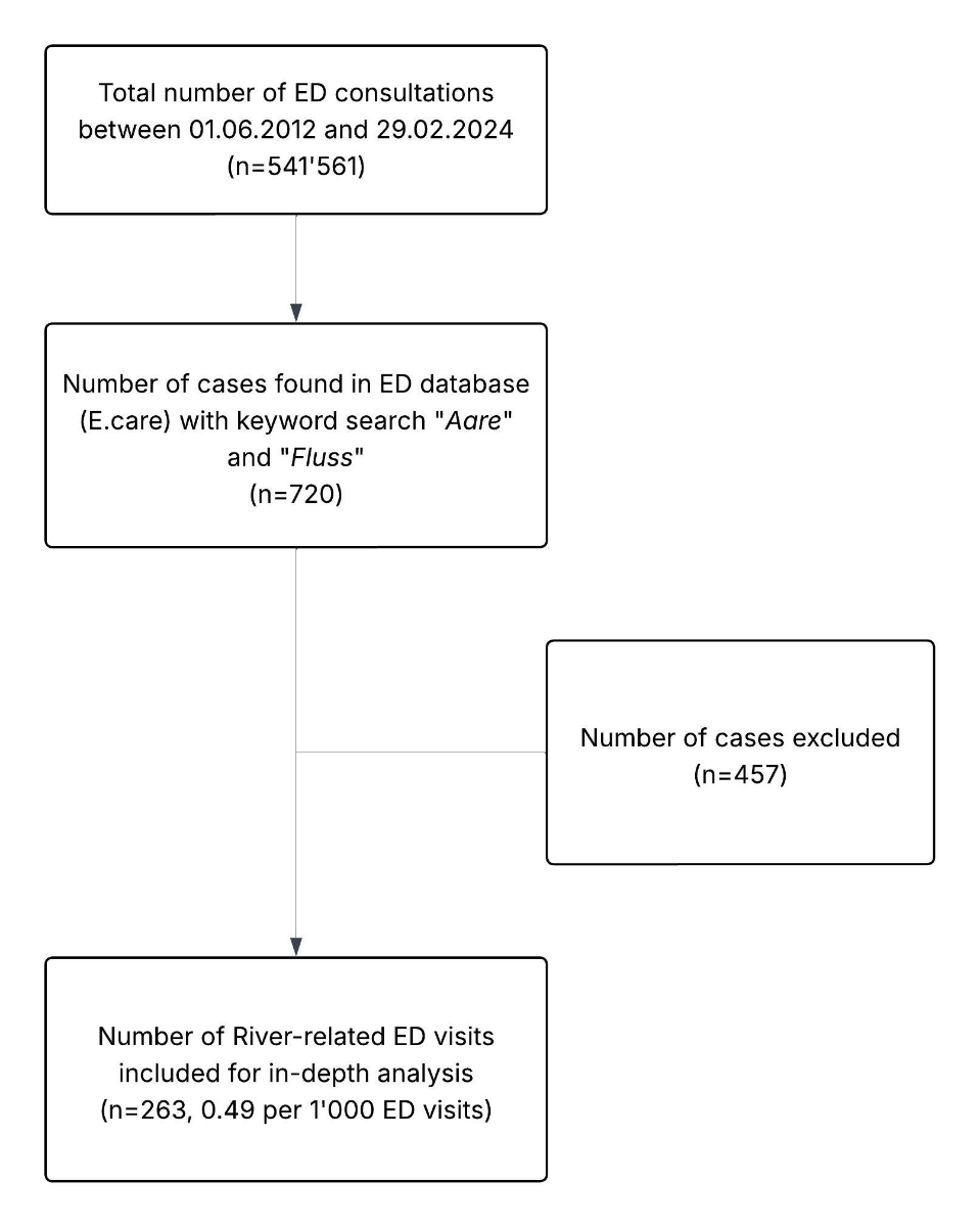 All medical records of patients who visited the ED during the study period were screened based on the inclusion criterion that the keyword “Aare” or “Fluss” appeared in the patient’s history at the time of admission. The keywords were used to ensure comprehensive identification of river-related incidents. The term “Fluss” was included to capture all cases referring to any river exposure, while “Aare” was added because the Aare is the most frequently visited river in the Bern region, and is therefore expected to account for most river-related injuries.