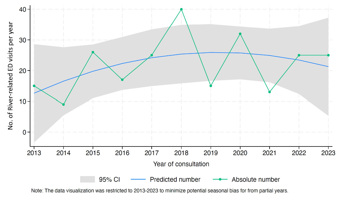 Figure 2Number of river-related ED visits per year over the study period. Note: The green line represents the absolute number of river-related ED visits per year. The blue line represents the predicted trend, with the grey area indicating the 95% confidence interval, based on a fractional polynomial model. Abbreviations: CI: confidence interval; ED: Emergency Department.