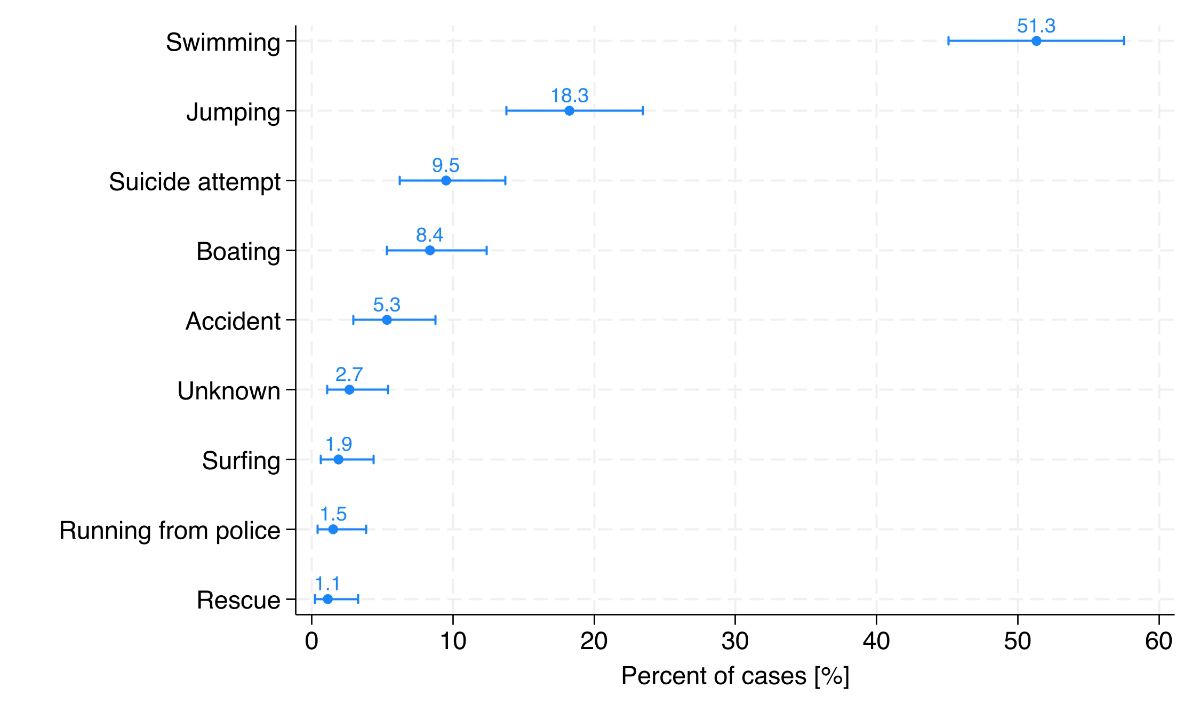 More than half of the injury events in our cohort were triggered by swimming (51.3%), followed by bridge jumping (18.3%) and boating (8.4%). These findings likely reflect the specific recreational culture surrounding rivers such as the Aare, where swimming long distances downstream is a long-standing seasonal practice, particularly in the city of Bern [1, 2]. The high accessibility of the river, combined with minimal barriers to entry and limited formal supervision, may increase exposure and the likelihood of adverse events during swimming.