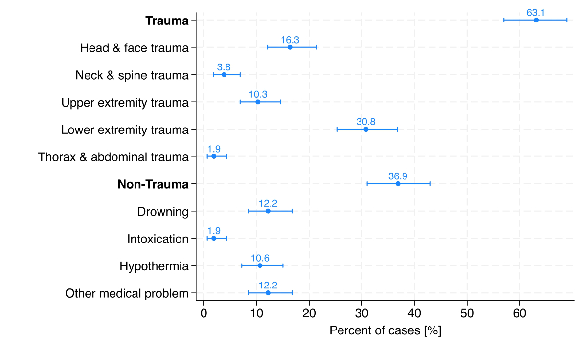 Among non-trauma diagnoses, intoxication was reported in 1.9% of cases, including behavioural disorders related to alcohol (3%) and multiple drug use (2.3%). “Other” medical problems accounted for 12.2% of cases, with cardiac arrest (4.9%) and otitis externa (3%) being the most common within this category.