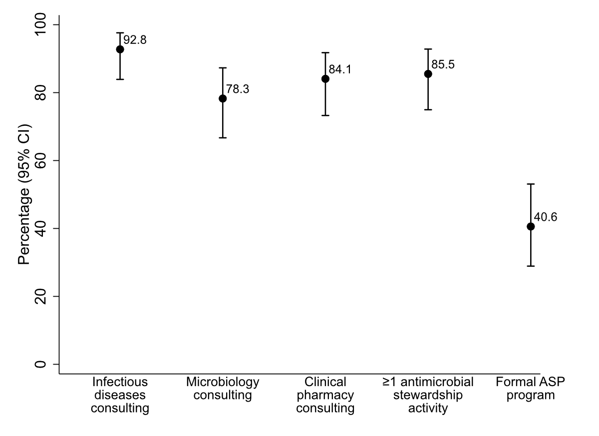 Figure 2 Proportion of hospitals (n = 69) reporting selected antimicrobial stewardship structures: providing infectious diseases, clinical pharmacy, microbiology consult services; hospitals with ≥1 stewardship activity and formal antimicrobial stewardship programmes. Error bars represent 95% confidence intervals. Abbreviations: ASP = antimicrobial stewardship programme.