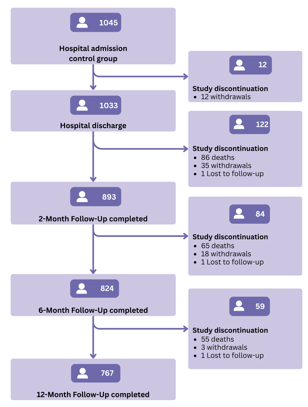 A total of 1045 patients were included at hospital admission. Follow-up data were available for 1033/1045 (98.9%) patients at hospital discharge, 893/1045 (85.4%) at 2-month follow-up, 824/1045 (78.8%) at 6 months and 767/1045 (73.4%) at 12 months (figure 1). The majority of dropouts (206/277 [74%]) were due to death.