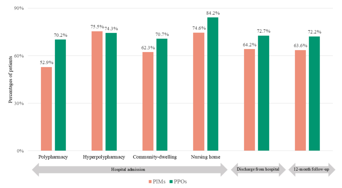 Figure 2 Percentages of patients with at least one potentially inappropriate medication or potential prescribing omission. Values represent percentages of patients with at least one potentially inappropriate medication or potential prescribing omission. Polypharmacy is defined as the use of 5–9 long-term medications; hyperpolypharmacy as the use of ≥10 long-term medications. Abbreviations: PIM: potentially inappropriate medication; PPO: potential prescribing omission.