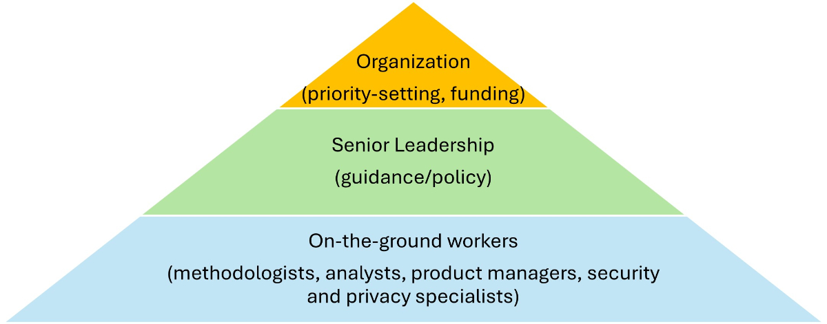 Decisions are made by senior leadership but require organisation-wide restructuring to allow product managers, security specialists and privacy experts to ensure work with PHI is appropriate (figure 2). Moreover, the transition directly affects on-the-ground workers tasked with implantation and use, requiring persistent messaging and support for successful change management [18].
