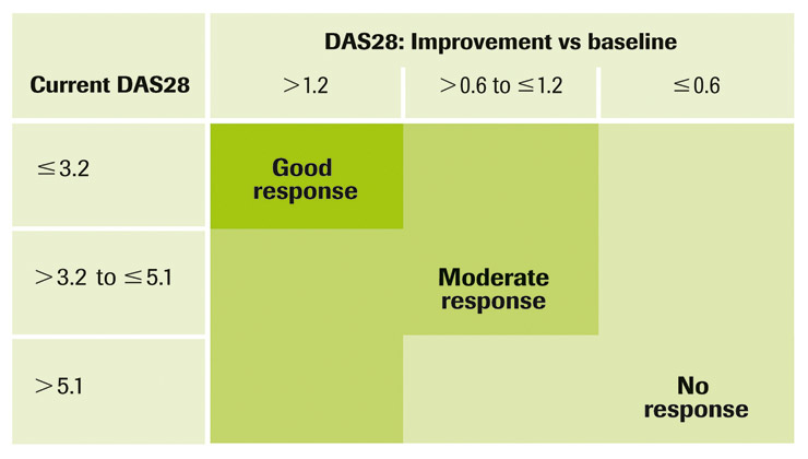 Disease activity and its evaluation remains a challenging concept. This recommendation uses the DAS28 index as a tool to simplify implementation of a standardised re-treatment strategy. DAS28 includes assessment of swollen and tender joints, pain and CRP or ESR. Its use allows defining the degree of disease activity as well as response to treatment (EULAR response criteria, fig. 1) [12]. However, the clinician should keep its limitations in mind, and individual components of the DAS28 as well as other symptoms of disease activity such as fatigue have also to be evaluated for concordance with the DAS28 value and the EULAR response.