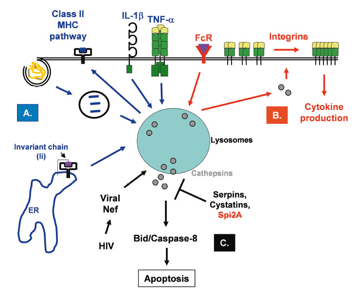 Roles of cathepsins in adaptive immunity. A. Lysosomal proteases remove the invariant chain (li) chaperone and introduce cleavages in endocytosed antigens which will consequently trigger unfolding and capture of processed antigen by newly synthesised class II MHC molecules. Moreover, cytokines (e.g. IL-1β, TNF-α) can modulate cathepsin activity and influence the class II MHC pathway. B. Activation of immune cells, for example following Fc receptors (FcR) ligation by immune complexes, induces conformational changes to surface receptors, such as β-integrins, increasing integrin affinity for its ligands. By an unexplained mechanism, cathepsins access the cytosol and target integrins at the plasma membrane. Both rearrangement of their cytoskeleton and ligand binding result in clustering of these molecules, thereby increasing cell-to-cell contact or adhesion to extracellular matrices. C. Following induction of apoptosis by different stimuli, such as the viral protein Nef, lysosomal cathepsins are released into the cytosol. Once in the cytosol, these proteases will induce the proteolysis of different targets (e.g. caspase-8, Bid, and anti-apoptotic Bcl-2 family members) and activate the enzymatic signalling cascade of apoptosis. In the cytosol, the cathepsin activity can be kept in check by the cysteine protease inhibitors, serpins and cystatins.