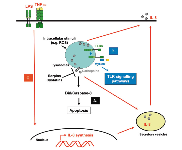 Roles of cathepsins in innate immunity. A. Depending on the cell type and the stimuli, cathepsins are rapidly released into the cytosol where they induce proteolysis of caspase-8 or the Bcl-2 family member Bid, which subsequently activates the enzymatic signalling cascade leading to apoptosis. Cysteine protease inhibitors, like serpins and cystatins, may regulate cathepsin activity in the cytosol. B. Lysosomal cathepsins induce proteolytic cleavage of TLRs (e.g. TLR7 and TLR9), which is a prerequisite for their signalling. The processed form then recruits the adaptor protein MyD88, which will in turn launch the different TLR signalling pathways. C. Inflammatory signals (e.g. LPS or TNF-α) induce the synthesis and secretion of cytokines and chemokines, such as IL-8. The secreted IL-8 precursor is converted into a mature form with enhanced neutrophil chemoattractant properties, by cathepsin activity.