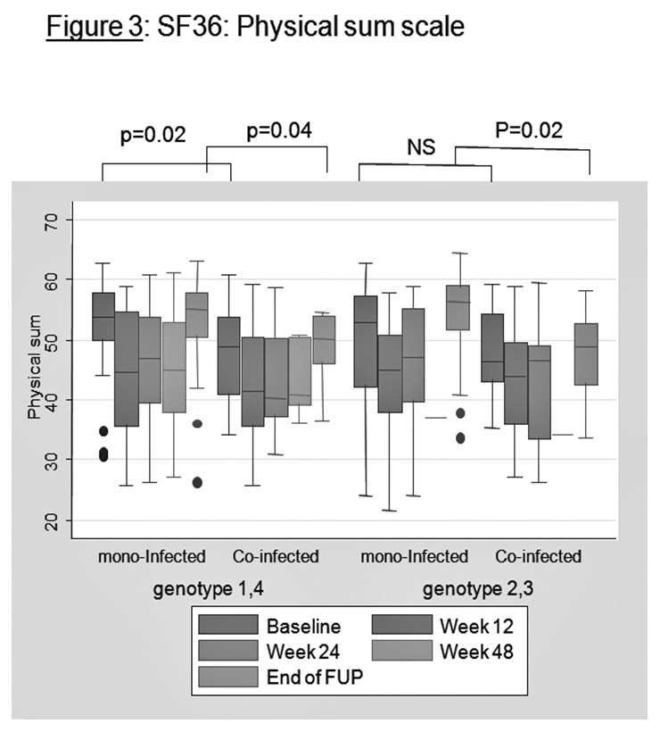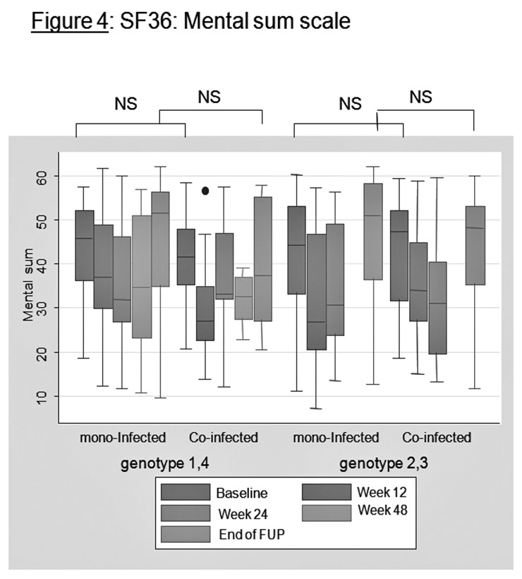 Figures 3 and 4 present the SF36 results graphically for the physical sum scale and for the mental sum scale between mono-infected patients and HIV-HCV co-infected patients. For physical sum scale, co-infected patients tend to have lower values at baseline (genotypes 1 and 4) and lower values at the end of follow-up (all genotypes). For physical functioning and general health, co-infected patients also have lower values at baseline and at end of follow-up (not represented).