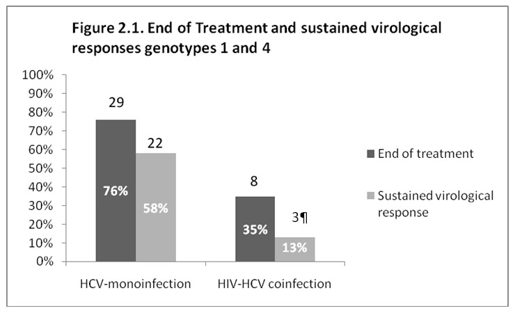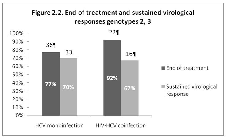 Figures 2.1 and 2.2 illustrate the virological response at the end of treatment and the sustained virological response (SVR) 6 months after cessation of treatment. For genotypes 1 and 4, SVR was observed in 22 out of 38 (58%) of the mono-infected patients and in only 3 out of 23 (13%) of the HIV-HCV co-infected patients (P = 0.001). For genotypes 2 and 3, 33 patients out of 47 (70%) of the mono-infected and 16 out of 24 (67%) of the HIV-HCV co-infected patients attained an SVR (P = 0.973). The low SVR observed in co-infected patients with genotypes 1 and 4 is due partially to the high drop-out rate; 9 out of the 23 HIV-HCV patients (39%) with genotypes 1 and 4 who completed the treatment had an SVR.