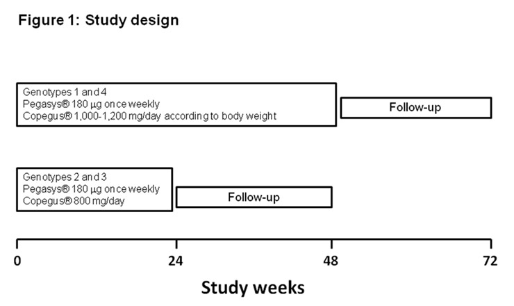 Eligibility criteria also included liver biopsy findings consistent with the diagnosis of chronic hepatitis C (when liver biopsy was not contra-indicated), compensated liver disease (Child-Pugh A), haemoglobin in males and females ≥110 g/l, absolute neutrophil count >1500 cell/mm3, platelet count >75.000/mm3, a negative HbsAg, ANA ≤1:320 and no evidence of autoimmune hepatitis, TSH within normal limits or adequately controlled thyroid dysfunction, and negative urine or blood pregnancy test for women of childbearing age potentially documented within the 2–3-week period prior to the first dose of the study drug. Additionally, all fertile males and females were required to use effective contraception during treatment and for 6 months after treatment end.