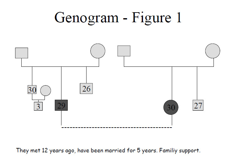 In close collaboration with the attending physicians, specific psychological counselling is offered to each patient or couple concerning the possible options for fertility preservation and their implications in cancer patients. The literature abounds in recommendations favouring the offer of counselling, yet the published articles provide limited information on the type of approach that is best suited to the needs of cancer patients concerned about their fecundity. Strategies are the communication skills of active listening typically used in a patient-centred approach [4, 5]. In practice our approach constitutes an extension of the techniques of preventive counselling routinely offered to all infertile couples undergoing ART at our institution (Women`s Hospital, CHUV, Lausanne) [6, 7]. This assistance has been developed and conceptualised over the last 18 years as part of the collaboration between clinical practitioners in medically assisted procreation, sexual and reproductive health counsellors, psychologists and psychiatrists [6, 7]. The primary advantage of this counselling approach is its rapid effectiveness in sorting out possible difficulties. Cancer patients are forced to make instant decisions because of the urgency of cancer treatment. The counselling is used in these cases to assess rapidly the woman’s (couple’s) resources in order to choose the best option for each woman’s specific situation. The so-called genogram is used as a select tool in resources evaluation [8]. It involves joining with the couple in building a genealogical tree during the interview by representing their families of origin (but also their relatives and friends if they have a significant relationship with the couple). Notes or lines are added to show the relationships between the individuals. By building the genogram together the necessary investigations are given a natural and coherent direction and the biographical issues and the couple’s interactions can be highlighted. Figures 1, 2, 3 and 4 outline this technique.