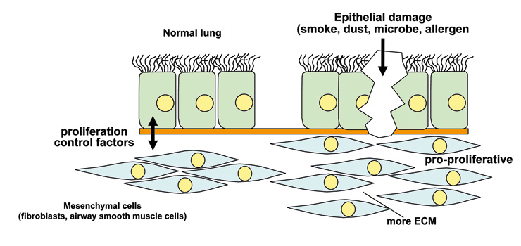 Tissue homoeostatsis is guaranteed by the interaction between epithelial cells and mesenchymal cells. Epithelial damage by mechanical stress or allergens or microorganisms can disrupt this interaction and lead to chronic inflammation.