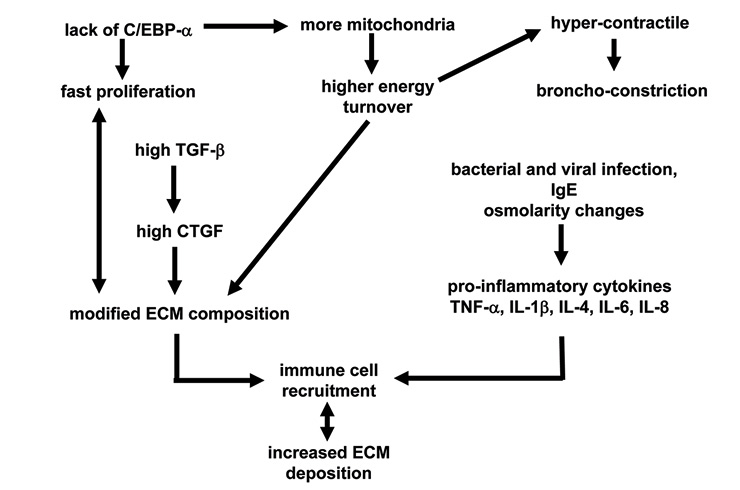 Microorganisms such as Chlamydia or Rhino-virus are a major cause of exacerbation in asthma and COPD, and they may activate airway smooth muscle cells directly via toll-like receptors (TLR) and glycol proteins. TLR recognise bacterial and viral proteins and stimulate an inflammatory response. For airway smooth muscle cells it appears that LPS is the most important direct ligand to TLR and thus increases airway hyper-responsiveness [43] and the secretion of pro-inflammatory cytokines such as IL-6, eotaxin, or ICAM [44–46]. The observation that microorganisms modulate the activity of differentiation and inflammation regulating transcription factors such as C/EBPs, NFκB, AP-1, and even the glucocorticoid receptor in various host cell types [47–49], requires investigation of this issue in airway smooth muscle cells in asthma and COPD. Such a mechanism could be regarded as a microorganism-induced reprogramming of the host cells’ function and thereby induce a state of chronic inflammation.