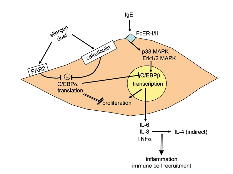 It is also possible that airway smooth muscle cells are activated by inhaled allergens or microorganisms by immune-globulin receptor-independent mechanisms which apply to both asthma and COPD. Chambers et al. reported that human airway smooth muscle cells express the protease-activated receptor-2 (PAR-2) and its activation caused muscle cell constriction [67]. This study also suggested an interaction of the IgE receptor pathway with PAR-2, since trypsin increased calcium release and proliferation in serum sensitised cells more than in non-sensitised cells. The same group reported later that PAR-2 activation in human airway smooth muscle cells led to increased secretion of PGE-2 and cyclo-oxygenase-2 [68]. Furthermore, Inflammation up-regulated the expression of PAR-2 by airway smooth muscle cells [69]. Importantly, most PAR-2 mediated responses of airway smooth muscle cells were not inhibited by glucocorticoids [70]. House dust mite allergens activated PAR-2 in epithelial cells [69], modulated the function of chloride channels [71] and stimulated the secretion of IL-6 and IL-8 [73, 74]. Unfortunately, animal models of PAR-2 function in airway inflammation contradict each other and no conclusions can be drawn. A summary of the function and possible interactions of PAR-2, calreticulin and IgE receptors on the function of airway smooth muscle cells is provided in figure 3.
