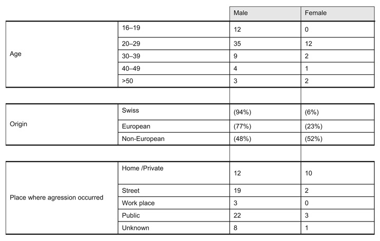 To be precisely identified, various types of sharp objects were recorded based on a visual standardised table. Demographics included age, gender, civil and professional status (working vs unemployed) as well as nationality, classified as Swiss, European or non-European. The circumstances of the aggression were specified with 4 items: 1) Place where the aggression occurred, 2) Relationship between the aggressor and the victim, 3) Number of aggressors, 4) Nature of violence. The modality of arrival to the hospital, the potential medical pre-hospital care and the need for initial resuscitation were also noted.