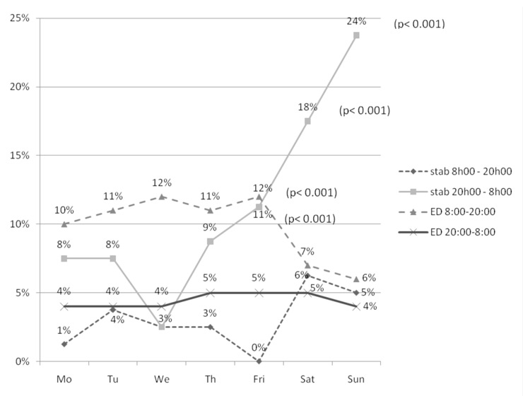Chronologic distribution of the surgical ED admissions: Penetrating trauma (stab) is over-represented at night on Friday, Saturday and Sunday when compared to the other surgical casualties (ED) (p <0.001).