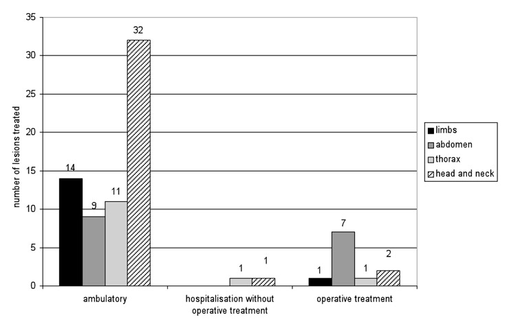 Out of the 66 patients (83%) treated on an ambulatory basis, 21 (25%) sustained multiple stab wounds. Thirty-four patients (43%) sustained head and neck trauma, the majority of which were superficial lesions of the scalp treated by simple sutures under local anaesthesia. Thirty (38%) patients sustained thoracic, or abdominal injuries or a combination of these. Limbs were injured in 15 cases (19%). Of these, 45 patients (74%) could be discharged the same day. The only patient whose thoracic lesion was operatively treated had a thoraco-abdominal injury actively bleeding from a liver laceration (abdominal AIS = 4; chest AIS = 1). The positive operative findings were a hepatic laceration, a duodenal and a multi-focal jejunal laceration. None of the limb injuries were complicated with vascular or nervous injury. The regional distribution of the lesions and the type of their management is described in the figure 5.