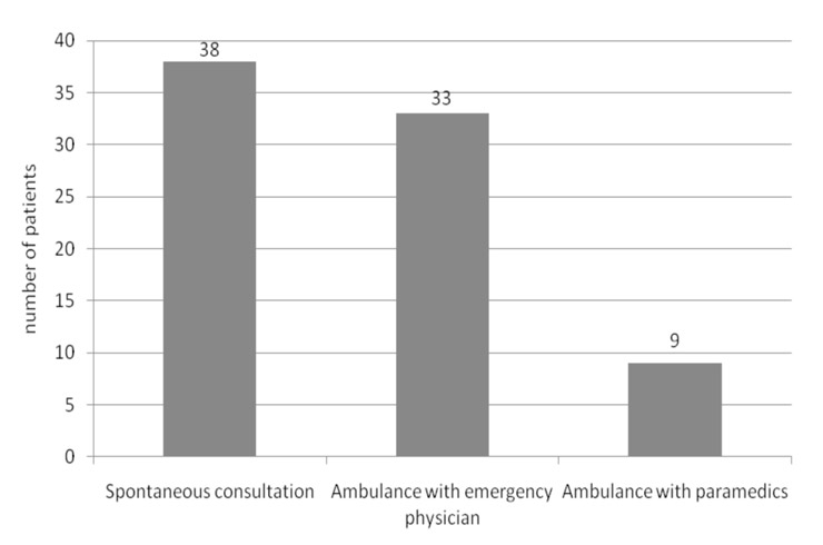 Nearly half of patients (n = 38/48%) came by themselves, including 2 patients who had sustained an injury to the abdomen and one patient with an injury to the thorax. Thirty-three (41%) patients were transported by an ambulance or a rescue helicopter staffed with an emergency physician. The ways used to reach the ED are described in figure 4. There was no correlation between the type of pre-hospital transportation and the severity of injuries.