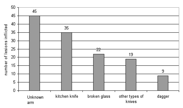 Number of injuries inflicted according to the type of weapon, in our cohort of 80 consecutive stab injuries.