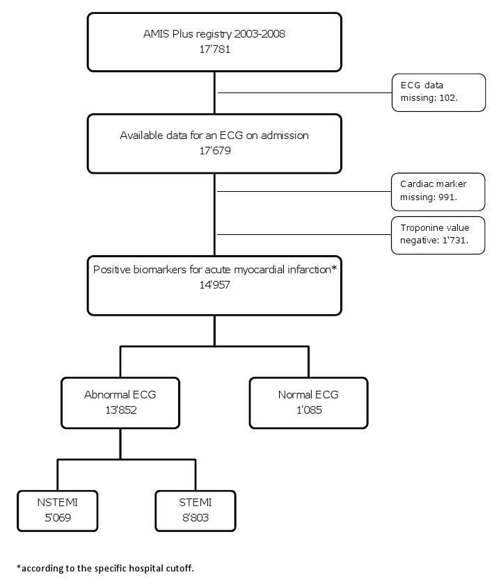 All patients included in this study fulfilled the criteria for enrolment in the AMIS Plus database and were admitted to participating hospitals in Switzerland between January 2003 and December 2008 with a diagnosis of AMI, which was defined as characteristic clinical symptoms and/or a typical ischaemia ECG pattern and troponins, elevated above the individual cut-off level for AMI of each particular hospital and with a valid ECG on admission. All patients are considered to have met the criteria for the ESC-ACC 2000 definitions for AMI [11]. Patients with missing data on the on admission ECG or on the cardiac marker value, and those with a discharge diagnosis of unstable angina, were excluded.