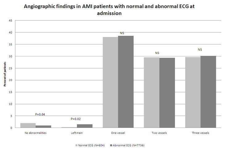 Angiographic findings in AMI patients with normal and abnormal ECG at admission.