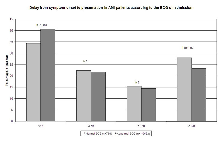 Patients with a normal/non-specific ECG presented with a longer delay (280 min; IQR 130, 835 min) after symptom onset than those with an abnormal ECG (230 min; IQR 115, 654 min), but this difference was not significant. Moreover, the patients who presented in the first 3 hours after symptom onset more often had an abnormal ECG (40.7% vs. 34.4%; p = 0.002), whereas a higher percentage of the patients presenting more than 12 hours after symptom onset (28.0% vs. 23.2%; p = 0.002) had a normal/non-specific ECG (fig. 2).