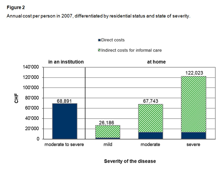 Figure 2 illustrates that the cost of dementia increases considerably with severity. Persons with severe dementia who live at home receive more than 50 hours of informal care per week. Due to the dramatic increase in informal care, the cost per person with dementia in the severe stage is lower in an institution than at home.