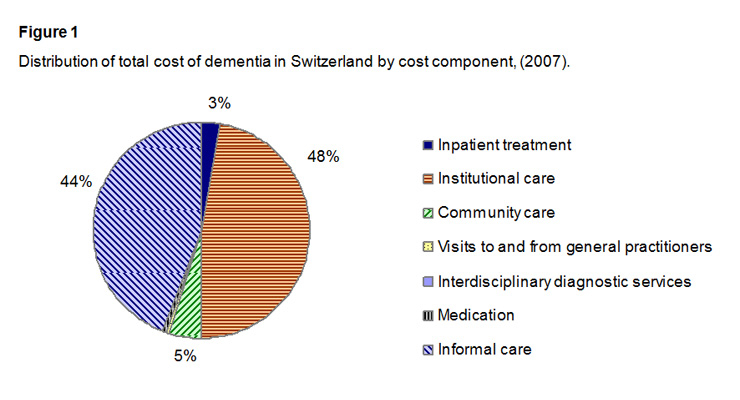 In conclusion, the present study indicates that dementia imposes a considerable economic burden on Swiss society. CHF 3.5 billion out of the total cost of CHF 6.3 billion are direct costs to the Swiss healthcare system, corresponding to a proportion of 6.3% of total health expenditure in Switzerland in 2007 [33]. Indirect costs of informal care amount to CHF 2.8 billion. In order to better understand the impact of dementia on the society and to improve decision-making regarding future strategies, there is a strong need for more dementia specific data and further analysis.