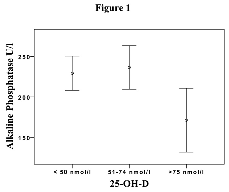 One-way-ANOVA showed significant difference between the means (p = 0.03). The graph shows that alkaline phosphatase was significantly lower in participants with 25-OH-D levels above 75 nmol/L.