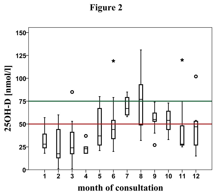 Circles indicate outliers (one and a half to three box-lengths outside the box), asterisks indicate extreme values (more than three box-lengths outside the box). The top line indicates the cut-off for vitamin D insufficiency (75 nmol/L), the bottom line indicates the cut-off for vitamin D deficiency (50 nmol/L). January corresponds to month 1, December to month 12.