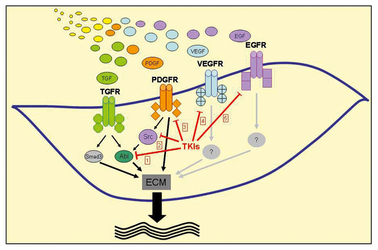 Targeting tyrosine kinases in systemic sclerosis. Transmembrane (TGF-β, PDGF, VEGF, and EGF receptors) as well as intracellular (c-Abl and Src kinases) tyrosine kinases promote the production and release of extracellular matrix (ECM) proteins. Pro-fibrotic downstream signaling of TGF-β and PGDF is well-established and involves Smad proteins, c-Abl, and Src kinases. By contrast, downstream pathways of VEGF and EGF that promote ECM synthesis in SSc fibro-blasts still need in detail characterisation. Regarding their central role in production and release of ECM, tyrosine kinases are promising targets for anti-fibrotic treatment approaches in SSc since they can be blocked by specific inhibitors (TKIs). 1) Imatinib, dasatinib, and nilotinib block the intracellular tyrosine kinase c-Abl, a downstream target of pro-fibrotic TGF-β signaling. 2) In addition to its effects on c-Abl and the PDGF receptor, dasatinib inhibits Src kinases, which link increased PDGF receptor activity with activation of c-Abl. 3) Imatinib, dasatinib, and nilotinib are inhibitors of the PDGF receptor, which can promote ECM production directly or via activation of Src kinases and c-Abl. 4) Semaxinib, vatalanib, sutent, and sorafenib block VEGF receptor signalling and might decrease ECM production. The exact mechanisms linking VEGF receptor signalling and ECM synthesis are still unclear. 5) Erlotinib, gefitinib, lapatinib, and canertinib block EGF receptors. Although downstream pathways of EGF signalling are only partially explored in SSc, activation of EGF receptors might contribute to increased synthesis of ECM in SSc fibroblasts.