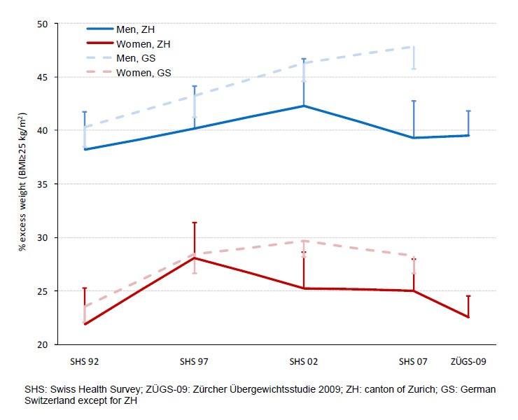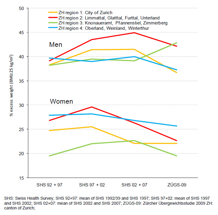 Excess weight prevalence stagnated (men) or decreased (women) in ZH, but increased or stagnated in GS. A decrease in excess weight prevalence is unique and unexpected for a developed country with internationally low rates. The trend observed in ZH over the past 17 years could be a harbinger of trends in other regions of Switzerland. Focussing on regional in addition to national trends can provide valuable information, rendering estimates of future developments more reliable. The next SHS, scheduled for 2012, will provide more information to assist in determining the validity of a possible trend reversal.