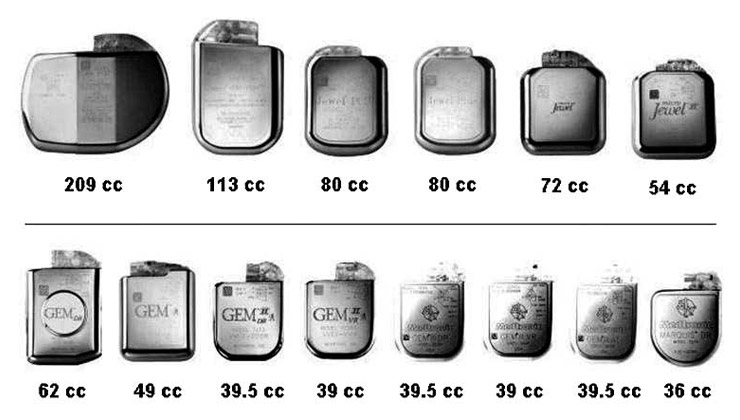 Reduction in the size of ICDs from 1989 to 2003. Source: Medtronic.