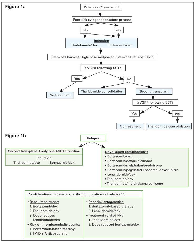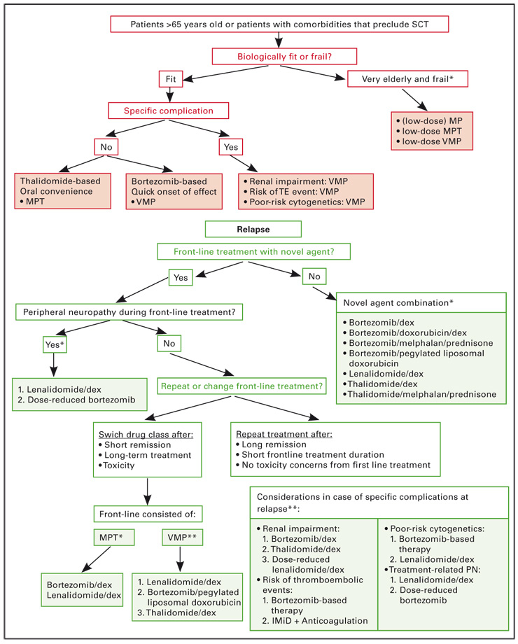 Currently, there are two treatment regimens that have become standard for the treatment of patients who are not eligible for transplantation: the combination of melphalan, prednisone and thalidomide (MPT) and the combination of MP and bortezomib (VMP). Figure 2a shows a possible treatment algorithm in the non-transplant setting.
