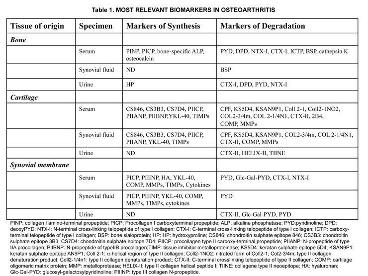 Molecular markers in OA have been the object of growing attention due to their potential usefulness in formulating early diagnosis, in assessing disease activity and severity and in evaluating drug effects [100]. In this respect, biochemical markers or biomarkers are ideal, as they are non-invasive and inexpensive measures [101]. The NIH-funded Biomarkers Network, a multidisciplinary group interested in the development and validation of biomarkers, has recently proposed the “Burden of Disease, Investigative, Prognostic, Efficacy of Intervention and Diagnostic” (BIPED) biomarker classification [102]. It may be concluded, however, that although a great number of substances are continually proposed, only a few can be considered true OA “disease markers” [100–108].