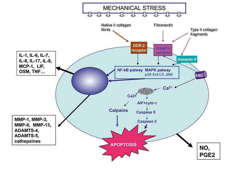 Chondrocyte changes induced by mechanical stress. Chondrocytes can respond to direct biomechanical perturbation by increasing expression of inflammatory mediators, including cytokines and proteinases, and stress response factors. Chondrocytes have receptors for responding to mechanical stimulation (mechanoreceptors), many of which are also receptors for extracellular matrix (ECM) components, including: integrins, a receptor for fibronectin and type II collagen fragments; discoidin domain receptor-2 (DDR-2), a receptor of native II collagen fibrils; annexin-V, a receptor of collagen II fragments. All these receptors interacts with intracellular signaling molecules to transduce mechanical signals into biochemical responses which lead to a production of number of proinflammatory substances, including cytokines, proteolytic enzymes, NO and PGE2. The most important among these intracellular signal cascades are NF-kB and MAPK pathways. The MAPK family, which include p38, Erk 1 and 2, and JNK, is of critical importance for cell survival, cell differentiation, and chondrogenesis. Other interesting ways stimulated by mechanical forces are the stretch-activated ion channels (SACs), which are believed to respond to membrane tension, interacting with integrins and leading to an elevation of intracellular calcium. This may stimulate mitochondria to release AIF and cytochrome c, which in turn activate pro-caspases 9 and 3 to produce caspase 9 and capsase 3, involved in chondrocyte apoptosis. To this process may also contributes calpains, a family of proteolytic enzymes stimulated by the rise in cytoplasmatic calcium from the ERG and mitochondria.