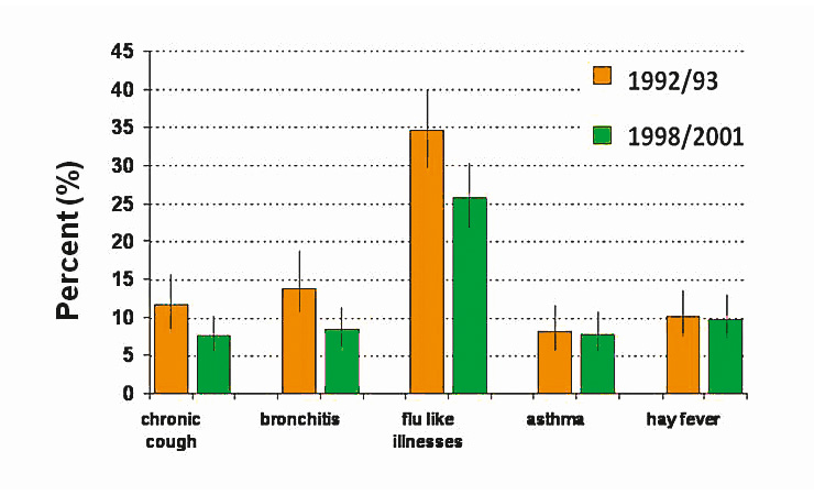 Symptoms: Several cross-sectional studies from Germany, Switzerland, France and the USA found as early as the 1980s, and have confirmed in very recent studies, that school-age or preschool children in communities exposed to higher levels of dust, SO2 and NO2 suffer more from cough and acute bronchitis than children in less polluted regions. With improving air quality the prevalence of some respiratory symptoms in schoolchildren decreases (fig. 2).