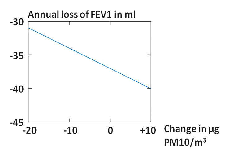 Decrease of PM10 from 1991 to 2002 and age-related loss of lung function in Swiss adults in the SAPALDIA study [13]. An increase in air quality of 10 µg PM10 × m–3 diminished the age-related loss of FEV1 by 3.1 ml annually.
