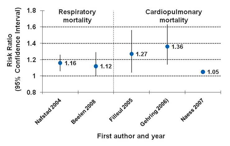 Relative risks (RR) for respiratory [44, 45] or cardiopulmonary mortality [46–48] with 95% confidence intervals (CI) from European cohort studies on air pollution expressed per 10 µg × m–3 NO2 or NOx. (No CI available for cardiopulmonary estimate in [48].)