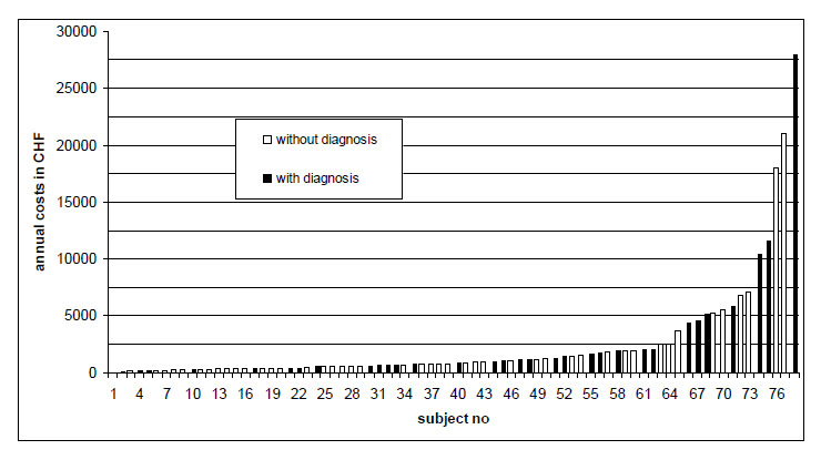 The cost difference between those with psychiatric treatment and those without treatment – either with or without a psychiatric diagnosis – is significant (t= 2.15; df: 20, doublesided p = .043*). Differences between the subgroups do not reach significance, probably because of the small sample sizes.